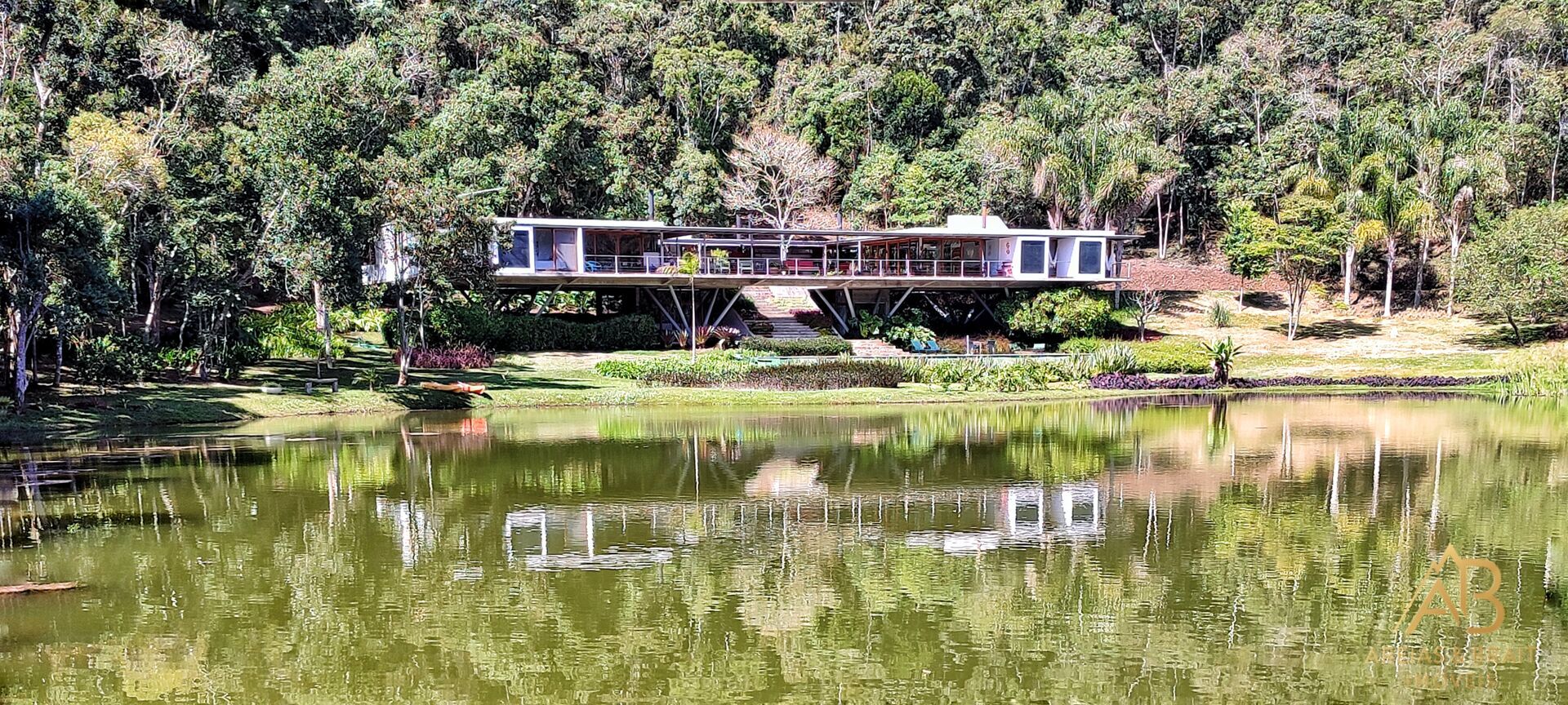 Elevada do solo para preservar o terreno natural e proporcionar vistas panorâmicas, a residência principal é um volume diáfano que flutua sobre a paisagem. O projeto, intitulado "Arquitetura para as Pessoas", prioriza a integração total com a floresta nativa e o lago privativo.